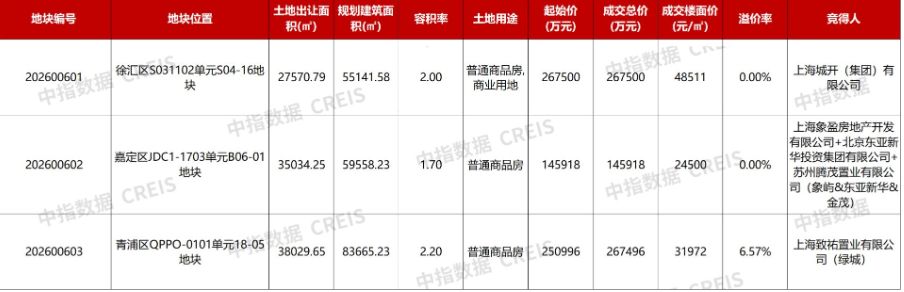 3月13日,上海2026年第一批次住宅用地集中出让顺利完成。徐汇长桥、嘉定新城地块分别被上实城开和金茂、象屿、东亚新华联合体获得,均以底价成交;青浦徐泾地块被绿城中国以总价26.75亿元拿下,溢价率6.57%,三幅地块成交总金额约68.09亿元。