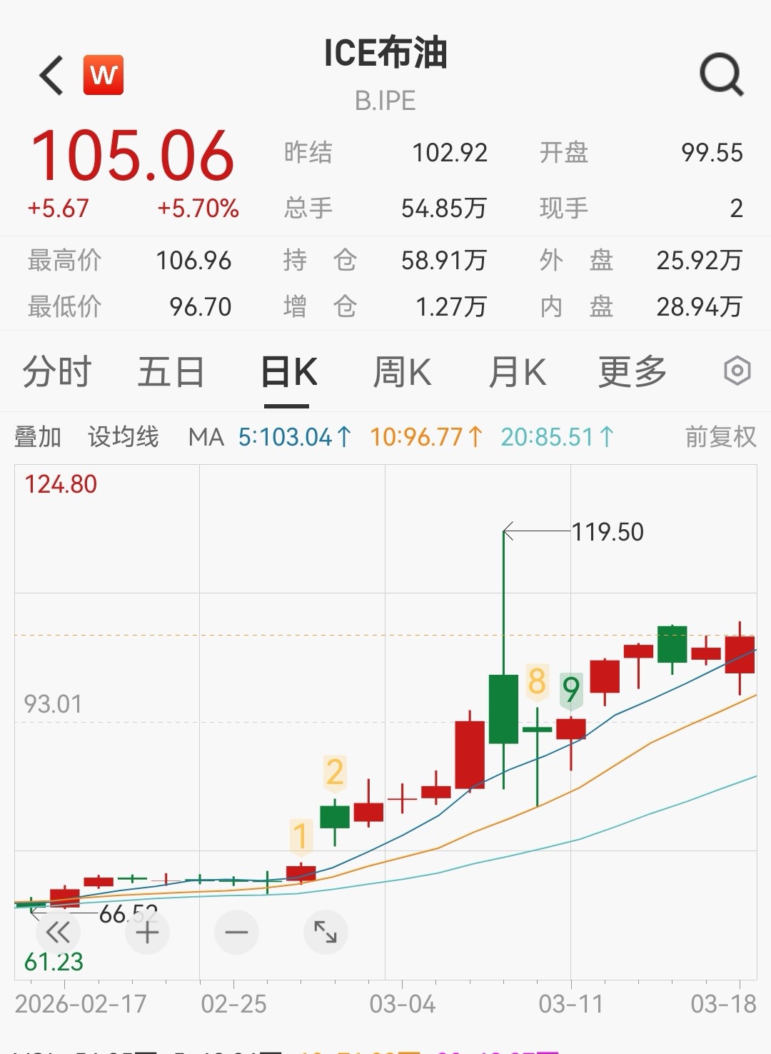 3月19日,国际油价上涨,布伦特原油上涨超5%,报105.06美元/桶。