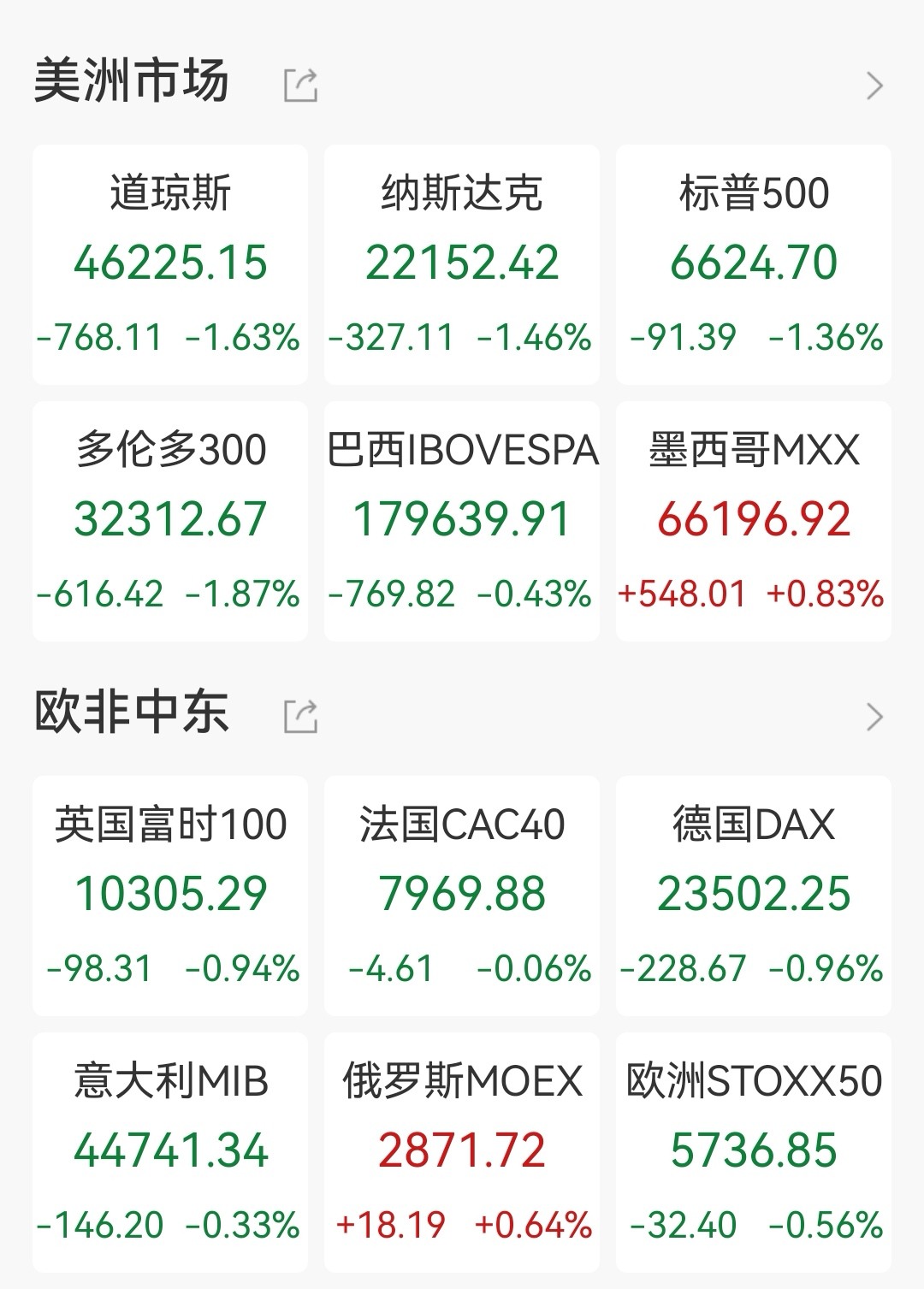 作为全球资产定价的锚,美债收益率的走高将压制高估值股票的估值,叠加投资者对政策不确定性担忧加剧以及中东地缘冲突急剧升级,共同压制风险偏好,引发股市同步承压。当日收盘,欧美股市集体收跌。美国三大股指跌超1%,美股大型科技股集体下跌,万得美国科技七巨头指数下跌1.47%。亚马逊跌超2%,微软、特斯拉、苹果、META、谷歌-C均跌超1%,英伟达跌0.84%。