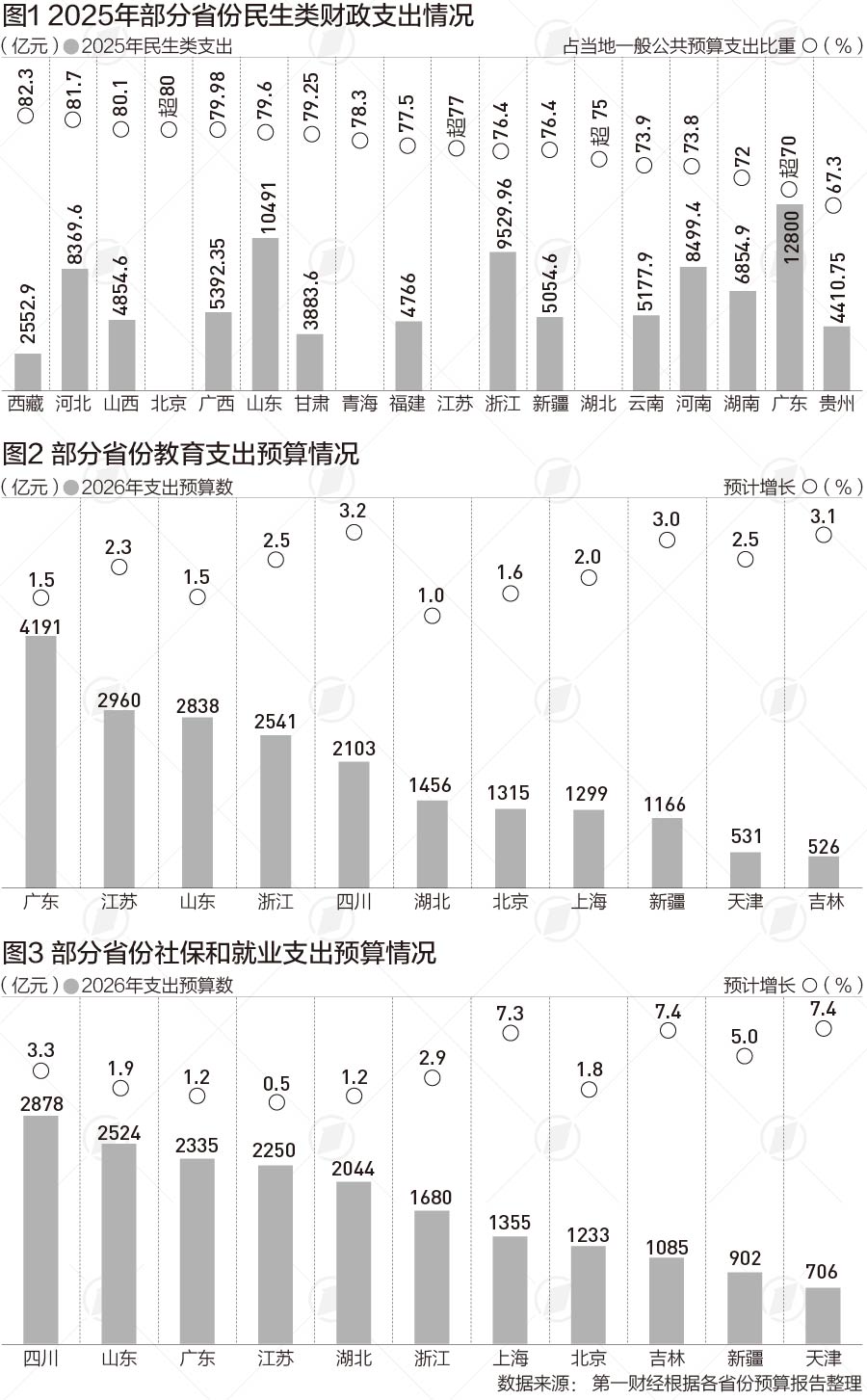 目前地方民生支出中三大主要项目是教育支出、社会保障和就业支出以及卫生健康支出。从部分省份详细披露的教育支出、社保和就业支出等数据来看,2026年这一支出均实现不同程度的增长,也体现了今年地方财政资金继续向民生倾斜。