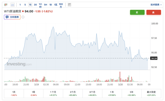 受上述消息影响,国际油价周五应声下跌。截至发稿,美国WTI原油期货下跌1.62%,跌破每桶95美元。布伦特原油期货下跌0.74%,但仍维持在100美元上方。