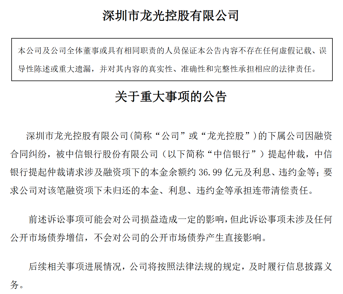 2026年3月19日,深圳市龙光控股有限公司发布公告,其下属项目公司因融资合同纠纷被中信银行提起仲裁,涉及融资本金余额37亿元及对应利息、违约金,中信银行(601998)同时要求龙光控股承担连带清偿责任。