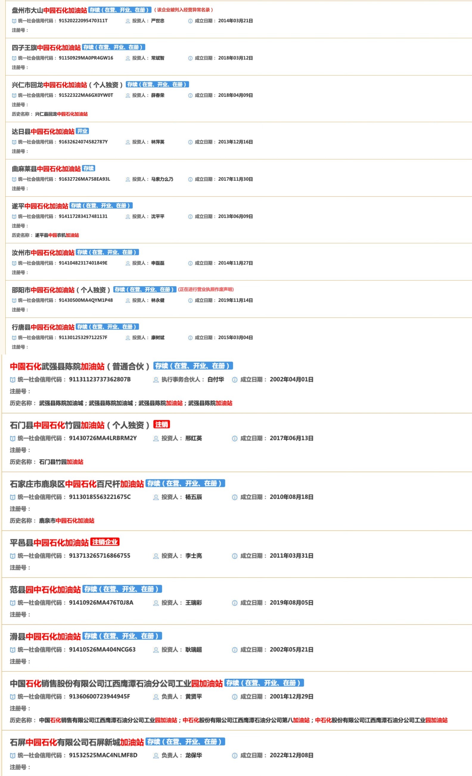 此外,还有多个企业名称带有“中园石化”的加油站已注销。(完)