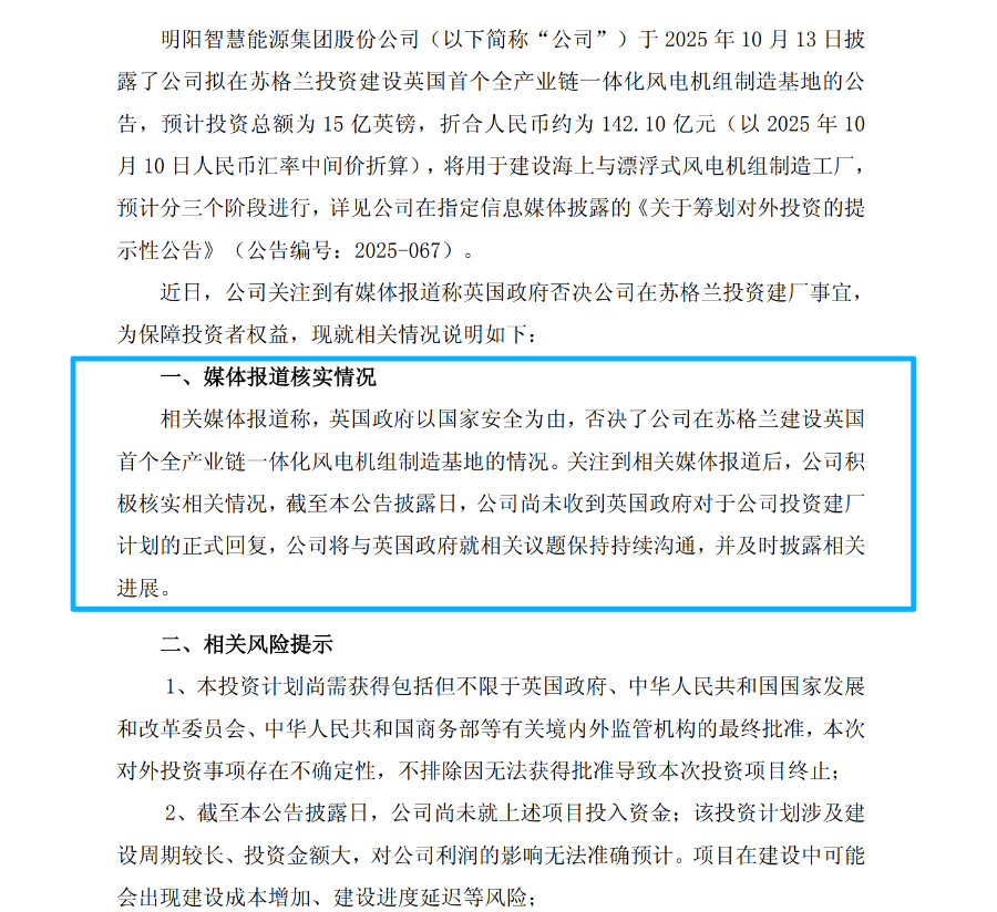 但在公告中,明阳智能也表示,该投资计划尚需获得包括但不限于英国政府、中华人民共和国国家发展和改革委员会、中华人民共和国商务部的最终批准,本次对外投资事项存在不确定性,不排除因无法获得批准导致本次投资项目终止。