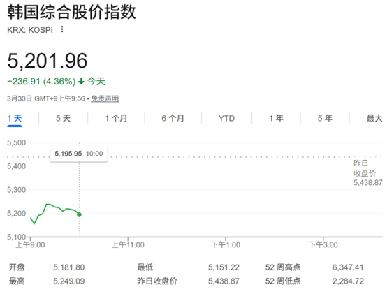 韩国KOSPI指数开盘下跌4.93%,跌幅一度扩大至逾5%,截至发稿,下跌4.36%,报5201.96点。韩国Kosdaq指数下跌近4%。
