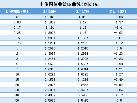 2026年3月27日,中债国债到期收益率1年期、2年期、3年期、5年期、7年期、10年期、30年期、50年期较3月20日分别变动-0.5BP、-1.23BP、-2.23BP、0.98BP、-1.21BP、-1.27BP、-3.84BP、-4.5BP。