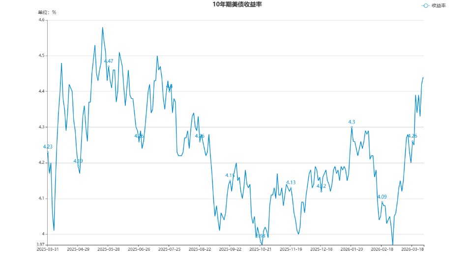 中东紧张局势持续令全球股债承压,美日欧等主要市场债券收益率上行。其中,10年期美债收益率全周上涨5BP,报4.44%,高点逼近4.50%关口;10年期日债收益率上涨11BP,报2.39%%,创1999年以来新高;10年期德债收益率上涨12BP,报3.11%。