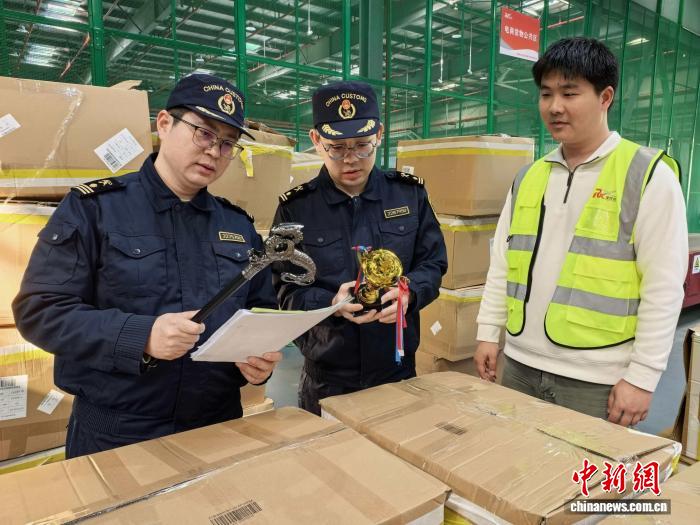3月31日,松江海关派员对松江综保区前置货站内一批跨境电商出口工艺品进行开箱检查。张玉楠摄