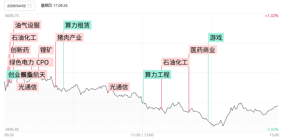 财联社4月2日讯,今日28股涨停,18股炸板,封板率为61%,津药药业5连板,星辉环材20cm3连板,新中港、通达股份3连板,新能泰山8天6板,中利集团10天6板,大东南6天4板,双鹭药业7天4板。市场全天震荡调整,创业板指、科创50指数均跌超2%。沪深两市成交额1.84万亿,较上一个交易日缩量1695亿。盘面上,全市场超4300只个股下跌。板块方面,油气设服、养殖、煤炭、航运港口板块领涨;算力租赁、AI应用、半导体、贵金属板块领跌;截至收盘,沪指跌0.74%,深成指跌1.6%,创业板指跌2.31%。