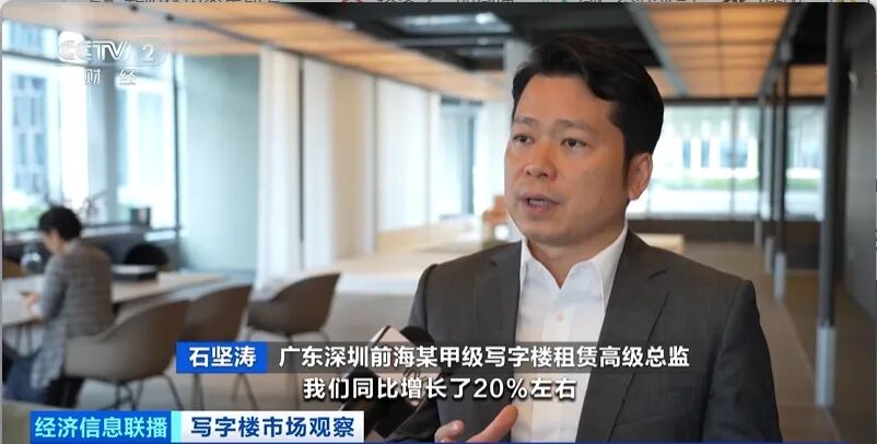 广东深圳前海某甲级写字楼租赁高级总监石坚涛:整体的租赁比去年第一季度增长了20%左右,一季度成交了1万多平方米。大约50%的成交是以科技类为主,大约30%是金融业,20%是专业服务业。