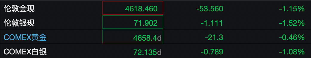 黄金、白银全线走低。
