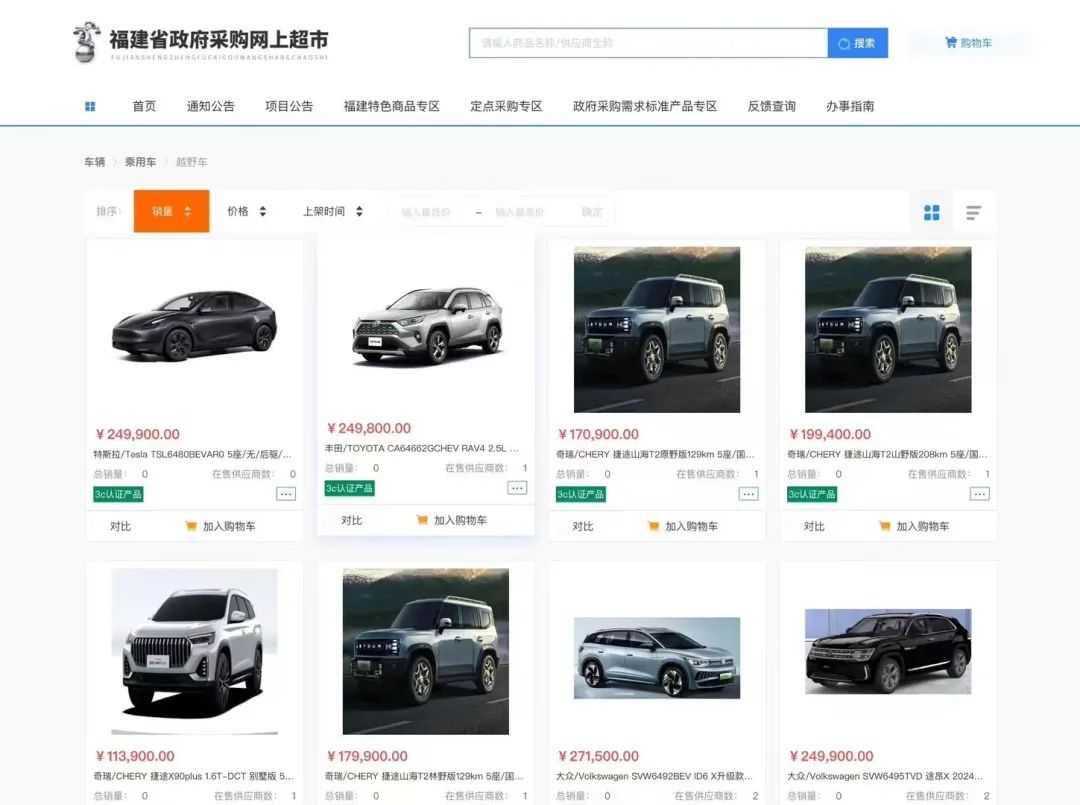 值得注意的是,特斯拉多个车型已进入地方政府采购平台,包括福建省政府采购网上超市、云南省政府采购云平台和吉林省政府采购云平台等。此外,特斯拉Model Y还进入了江苏省政府新能源用车采购目录,为全国首个特斯拉进入政府采购目录的案例。