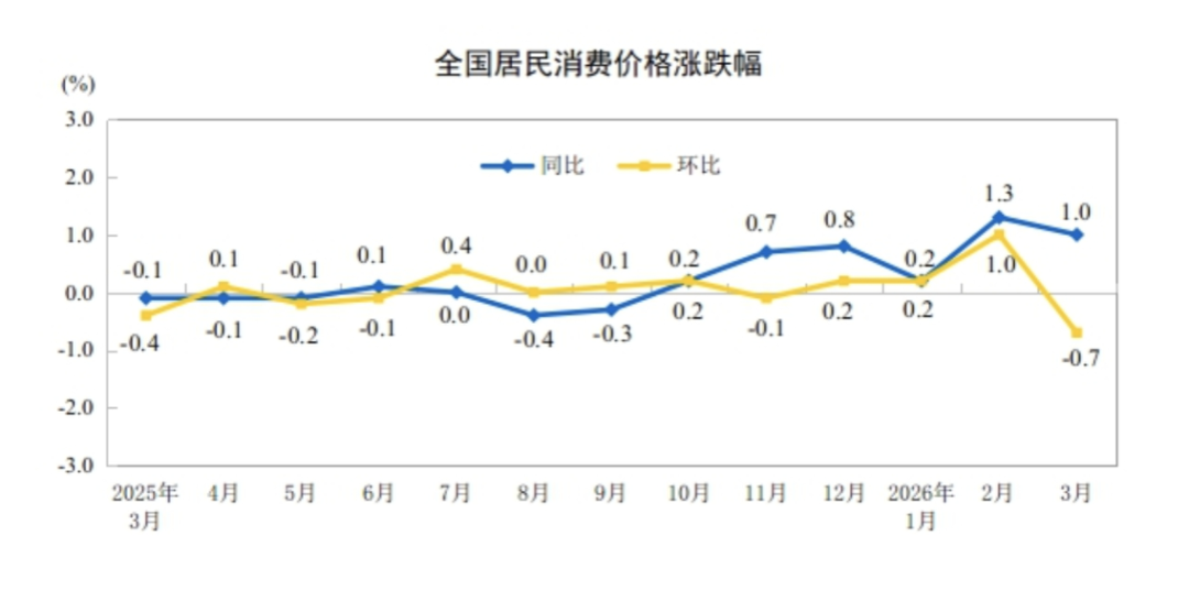 国家统计局发布数据显示,3月份,春节长假后消费需求季节性回落,居民消费价格指数(CPI)环比下降0.7%,同比上涨1.0%。