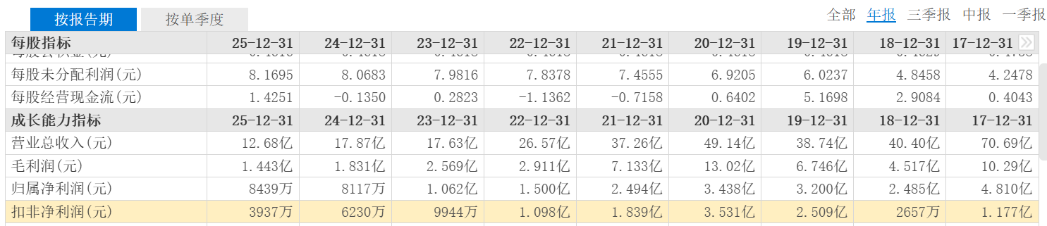 东方财富网数据显示,宁波联合的扣非净利已经是连续第五年下跌(2020年~2025年)。相较于公司2020年阶段高点的数据(扣非净利3.531亿元),公司2025年扣非净利仅3937万元,期间跌幅高达89%。