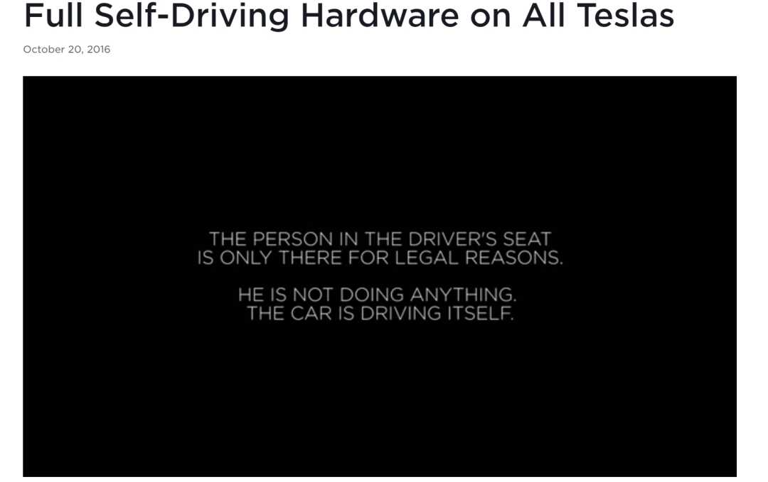 例如,特斯拉官方网站上至今仍挂着的一段视频中,公司声称“需人坐在驾驶座上仅因法律要求,驾驶者无需进行任何操作,车辆可实现自动驾驶。”