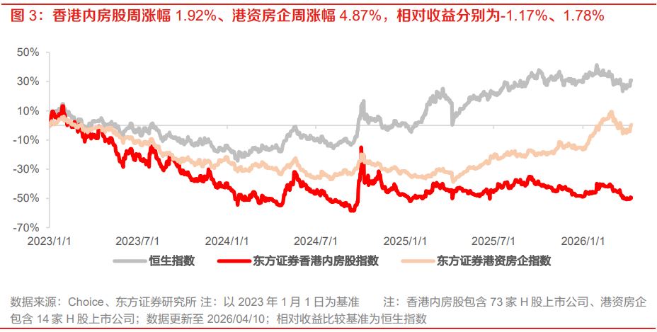 2026年“金三”核心城市房地产市场呈现温和修复态势,二手房热度显著优于新房市场。根据中指研究院统计,3月上海二手房成交3.1万套创五年新高,北京成交近2万套创15个月新高。我们认为,伴随核心城市二手房市场成交持续放量,本轮房地产周期企稳有望从二手房向新房逐渐传递,房价企稳回升预期强化下,地产板块估值有望持续修复。