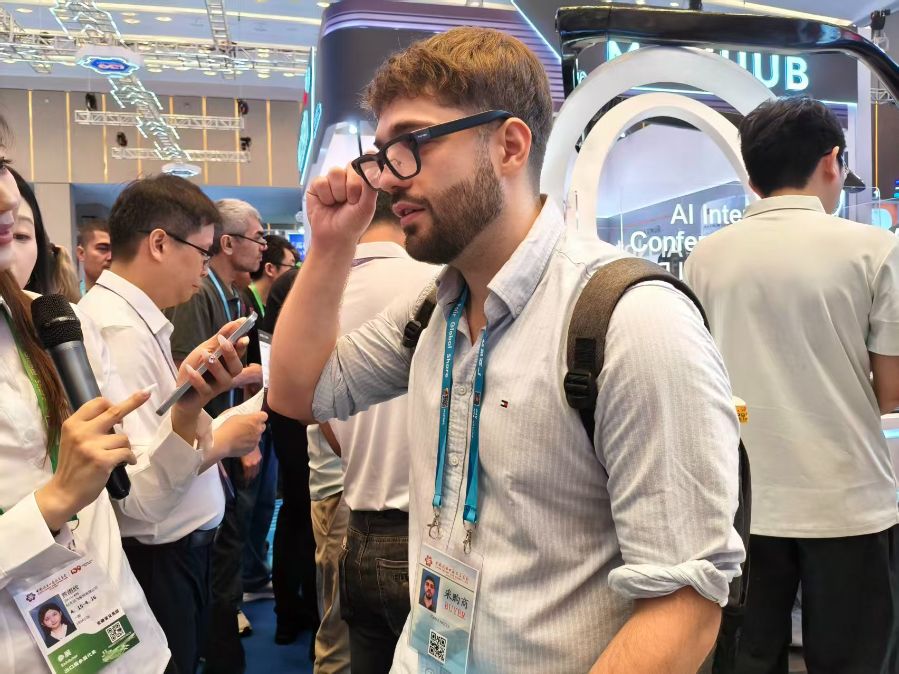 Ramtin端着一杯由机器人制作的咖啡,拉花图案正是他的一张照片。他对机器人和太阳能光伏板很感兴趣,喝完咖啡便再次扎入人潮。来自阿根廷的Tomas对试戴的AI眼镜赞不绝口——耳边是中文解说,眼前镜片上实时显示出翻译后的文字。