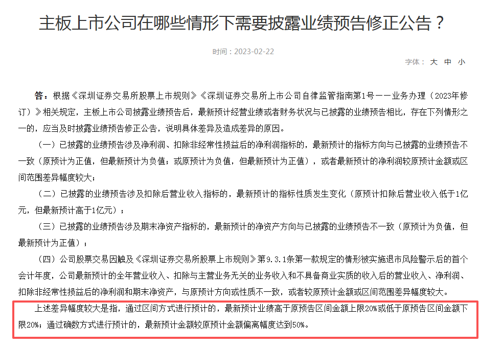 其中一条提及,已披露的业绩预告涉及净利润、扣除非经常性损益后的净利润指标的,最新预计的指标方向与已披露的业绩预告不一致,或者最新预计的净利润较原预计金额或区间范围差异幅度较大。
