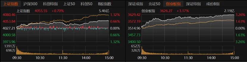 指数高开高走,沪指收涨0.7%报4055.55点,创业板指收涨3.17%报3626.27点,深证成指收涨2.05%。沪深300、科创50、北证50涨幅均超1%,上证50微红。