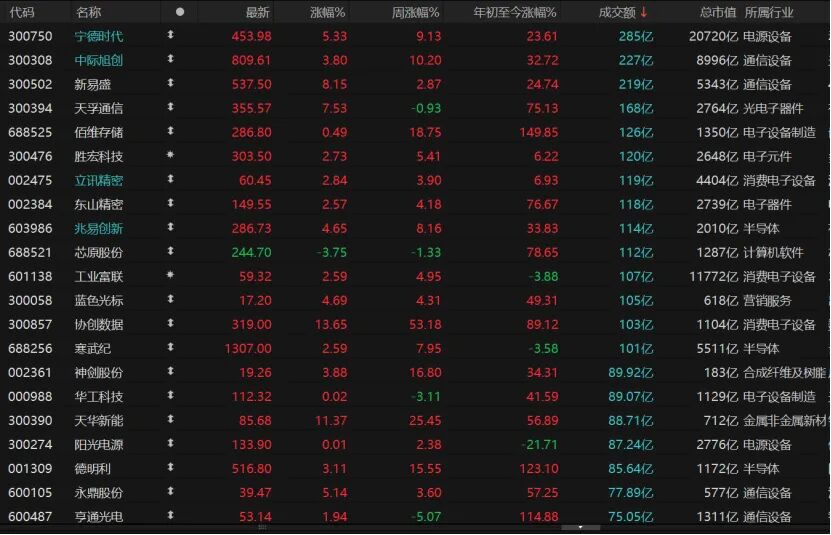 市场赚钱效应较好,共计4293只个股收涨,涨停股88只;1072只个股收跌,跌停股9只。14只个股日成交额超100亿元,CPO概念龙头股“易中天”(中际旭创、新易盛、天孚通信)集体大涨,半导体个股兆易创新、寒武纪同样表现亮眼。