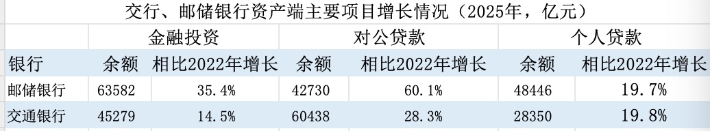 分析来看,主要因为邮储银行对公贷款、金融投资增长较快。同花顺ifind数据显示,2025年末邮储银行对公贷款余额4.3万亿元,相比2022年末增长了60%,这一增速是交通银行同期增速的两倍。