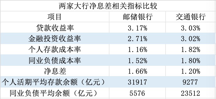 究其原因,邮储银行不仅资产规模更高、扩张速度更快,净息差也更高。财报数据显示,2025年邮储银行净息差为1.66%,高出交通银行46BP——其净息差优势不是来自资产端,而是来自于负债端。