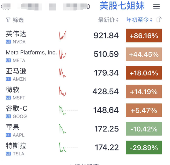 在科技股领域,苹果和特斯拉的股价表现近期已开始显露出疲态,与“七姐妹”中的其他公司相比,它们的股价涨幅明显滞后。