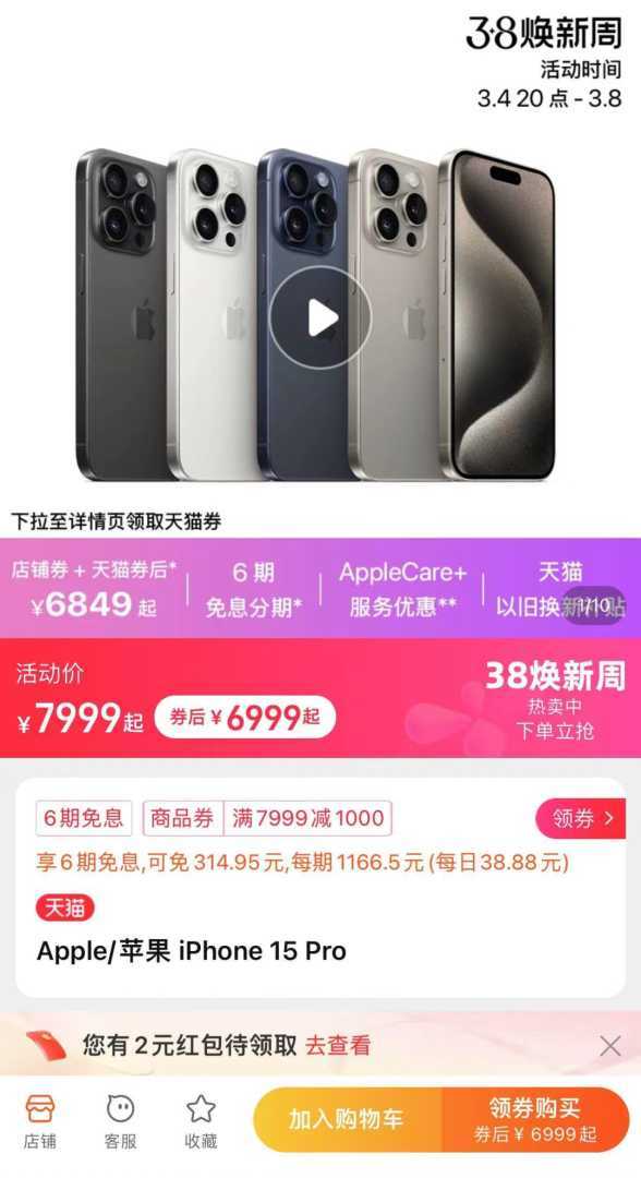 苹果在中国市场的表现早在农历春节前夕就露出了疲态,当时苹果一反常态地启动了“迎新春限时优惠”,iPhone 15系列4款机型降价500元。这一降价策略在3·8妇女节促销活动期间继续延续,iPhone 15再次迎来大降价,直降超千元。