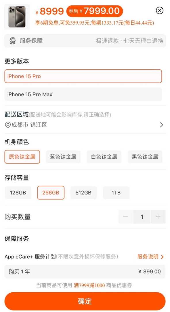 经查询发现,叠加店铺券和平台券后,同款iPhone 15 Pro 256G在淘宝苹果官方旗舰店的售价仅为7999元,远低于官方售价8999元。
