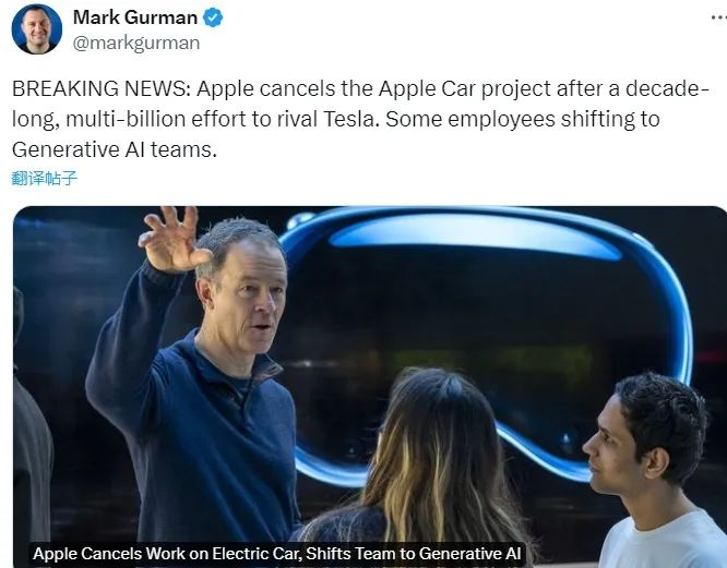苹果电动车项目或将终结,全力投入生成式人工智能