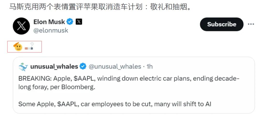 特斯拉CEO马斯克在得知此消息后,第一时间在社交媒体上表示了“致敬”和“点烟”的惬意表情,似乎对潜在竞争对手的退出感到庆幸。