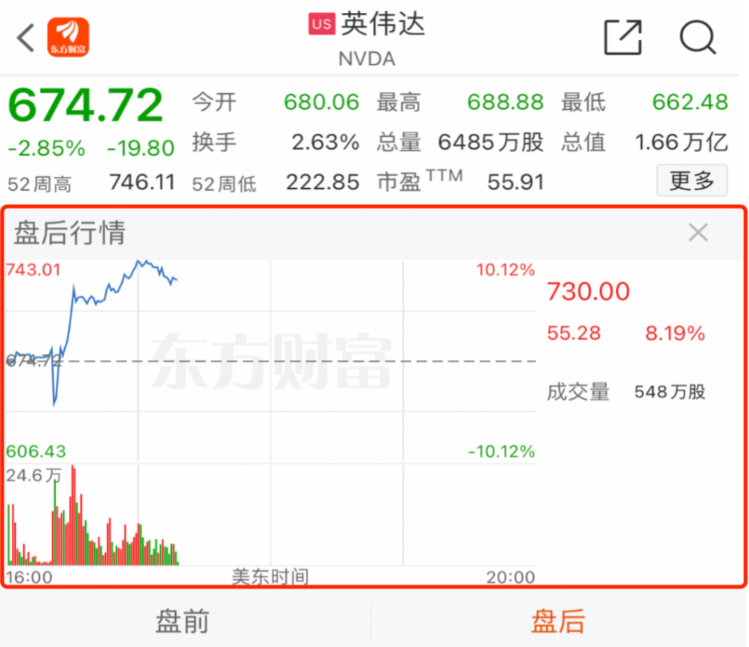 截至发稿,英伟达股价盘后上涨7.5%,竞争对手AMD股价盘后上涨2.6%,英特尔股价盘后上涨0.57%。