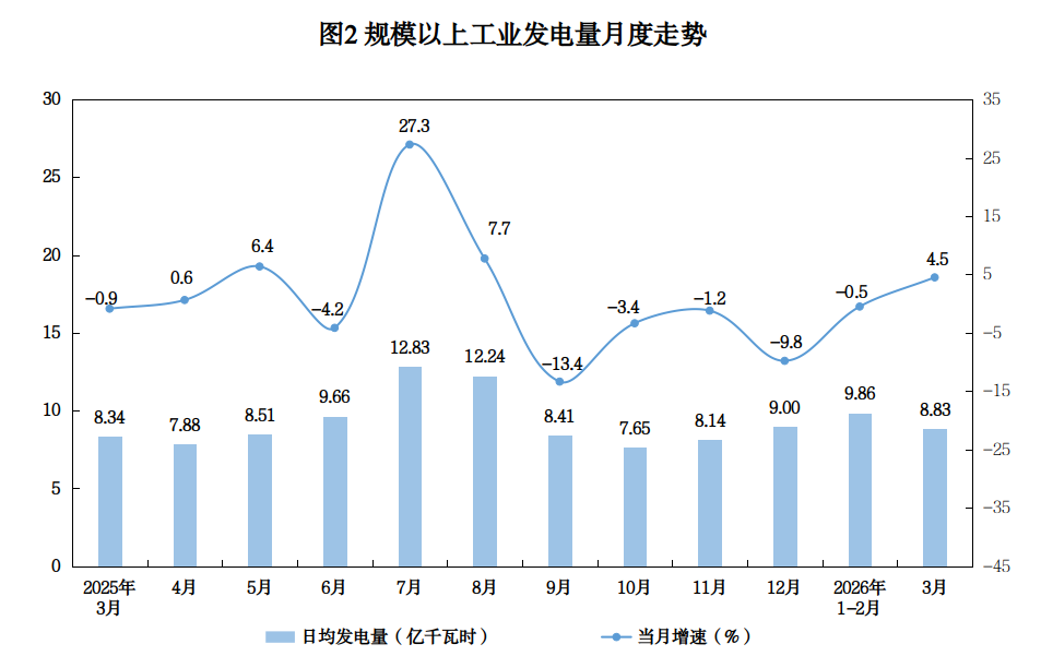 电力生产由降转增。3月份,规模以上工业发电量273.64亿千瓦时,增速由1~2月份下降0.5%转为增长4.5%,日均发电8.83亿千瓦时。