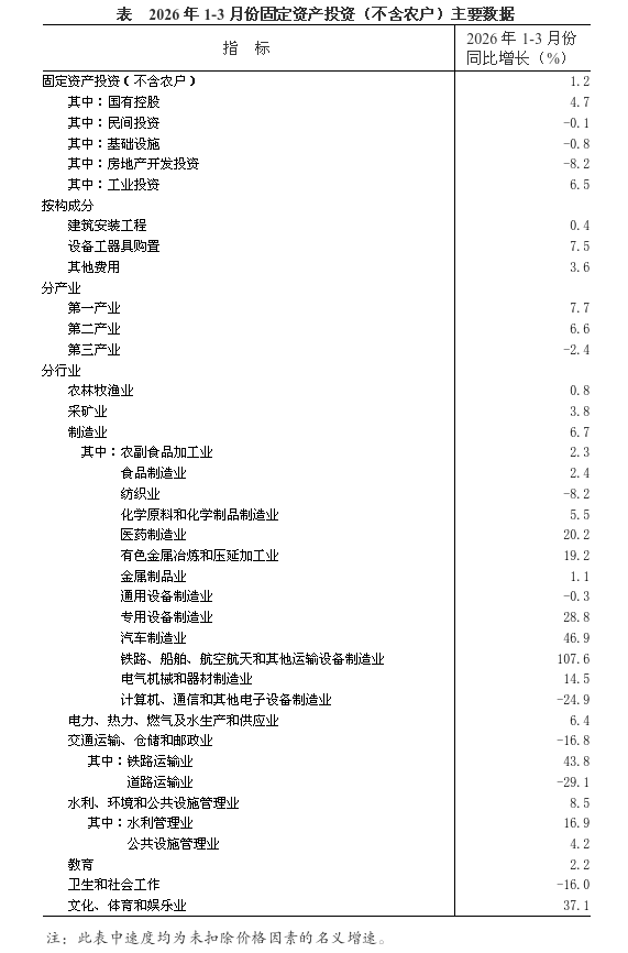 2026年1~3月份,全省固定资产投资(不含农户)同比增长1.2%。其中,民间投资下降0.1%。