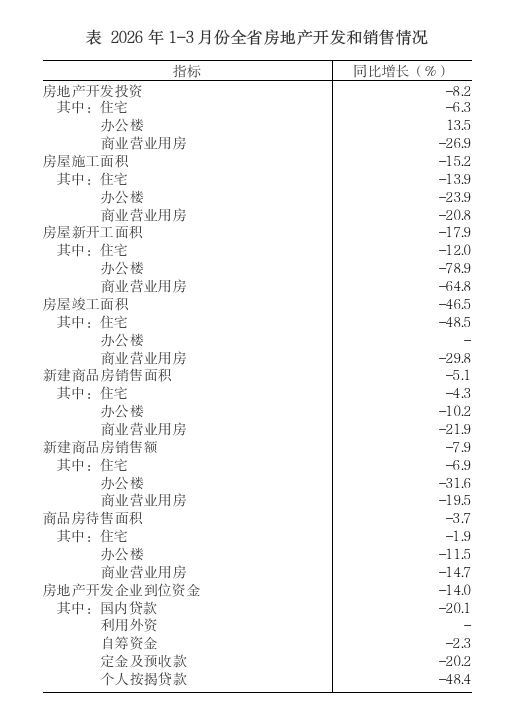 1~3月份,全省新建商品房销售面积同比下降5.1%。其中,住宅销售面积下降4.3%。全省新建商品房销售额下降7.9%。其中,住宅销售额下降6.9%。