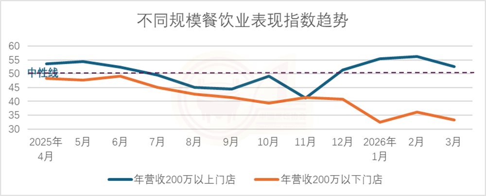 规模以上门店表现指数为52.70,虽环比下降但仍维持在中性水平以上;而规模以下门店表现指数仅为33.30,大幅低于中性水平,门店销售额指数更是降至28.07。两者差距达19.40,分化态势扩大。