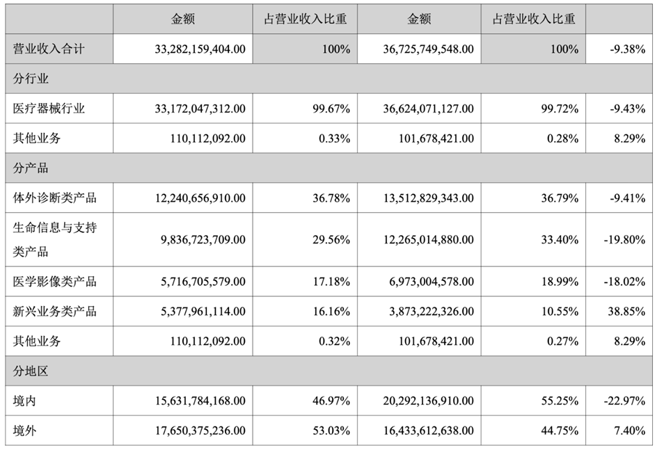 国内医疗设备的整体采购需求也在持续收缩。医疗器械审批流程趋严、医院新建与改扩建项目节奏放缓,叠加疫情期间集中采购透支了部分后续需求,使得行业整体采购周期大幅拉长。迈瑞医疗监护仪、超声等传统主力产品销量明显下滑,生命信息与支持业务全年收入98.37亿元,同比降幅接近两成,医学影像业务收入57.17亿元,同比下滑18.02%,几大传统优势业务同步承压,直观反映出国内市场需求的疲软态势。