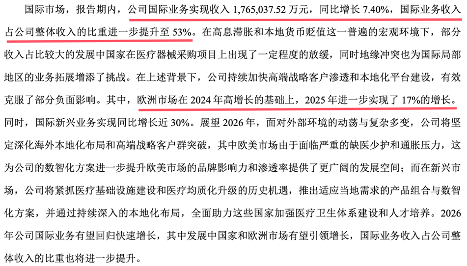 管理层对2026年的预期相对谨慎乐观,认为国内业务有望恢复正增长,行业最困难的阶段或已过去。但从现实基础来看,需求恢复节奏仍存在较大不确定性:医院端预算修复进度、政策边际变化方向以及设备更新周期长短,均将直接影响国内市场的回暖速度。与此同时,海外市场虽仍有拓展空间,却也面临多重扰动,高利率环境对全球医疗支出的压制、汇率波动对业绩的冲击等因素都可能成为潜在风险,且全球化布局越深入,外部变量带来的不确定性就越复杂。