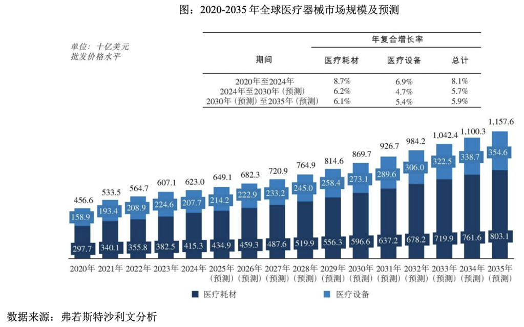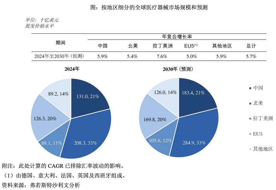 值得注意的是,迈瑞医疗的国际市场成长空间仍十分广阔。根据弗若斯特沙利文的数据,2024年全球医疗器械市场规模达6230亿美元,其中中国市场份额约为21%,成熟市场总计约为53.7%,新兴市场占比约为25.3%,海外医疗器械市场容量相当于国内的四倍。