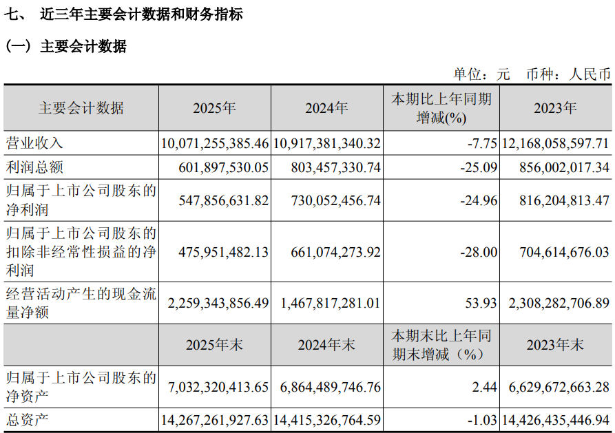4月21日晚间,苏垦农发(601952)公布2025年年报,公司营业收入为100.71亿元,同比下降7.75%;归母净利润为5.48亿元,同比下降24.96%;扣非归母净利润为4.76亿元,同比下降28%。公司拟向全体股东每10股派发现金红利1.5元(含税)。