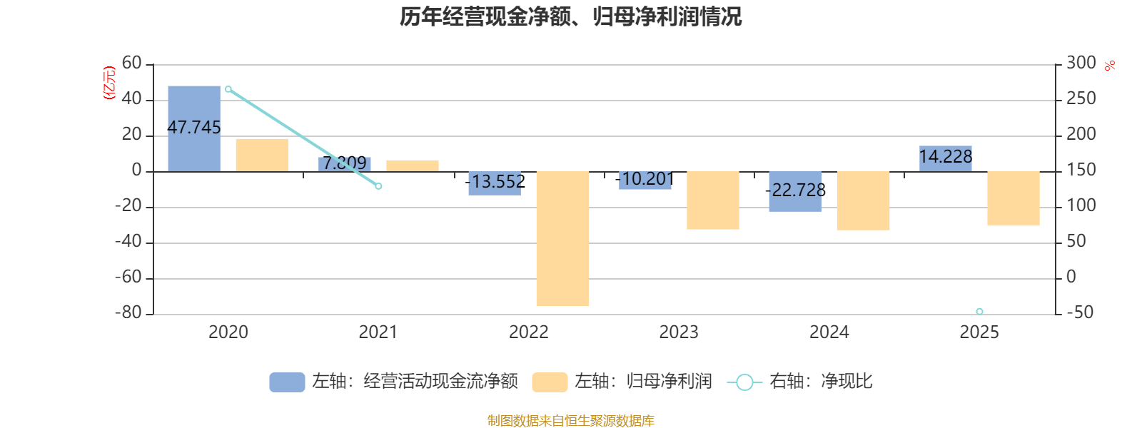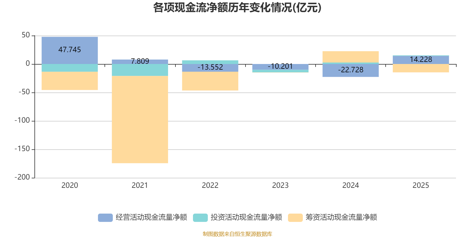 2025年,公司经营活动现金流净额为14.23亿元,同比增加36.96亿元;筹资活动现金流净额-14.7亿元,同比减少34.58亿元;投资活动现金流净额1.02亿元,上年同期为2.62亿元。