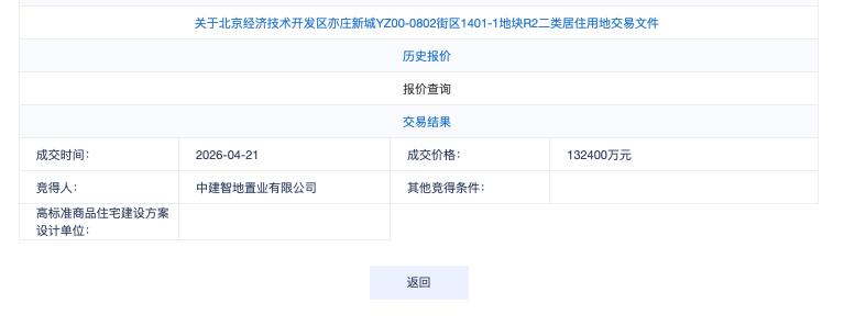 4月21日,北京迎来年内首次住宅用地现场竞拍,5家房企争夺北京经济技术开发区亦庄新城YZ00-0802街区1401-1地块R2二类居住用地(以下简称“亦庄瀛海1401-1地块”)。经过49轮竞价,最终由中建智地以13.24亿元的价格竞得,溢价