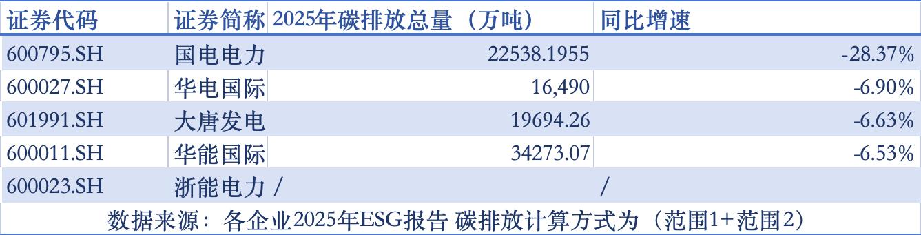 截至4月21日,A股28家火力发电企业中,有5家被纳入强制披露名单:浙能电力、华能国际、华电国际、国电电力、大唐发电。除浙能电力外,其余4家均已披露2025年度ESG报告。国电电力2025年温室气体排放总量约为2538.20万吨二氧化碳当量,同比下降28.37%,减排幅度居首。