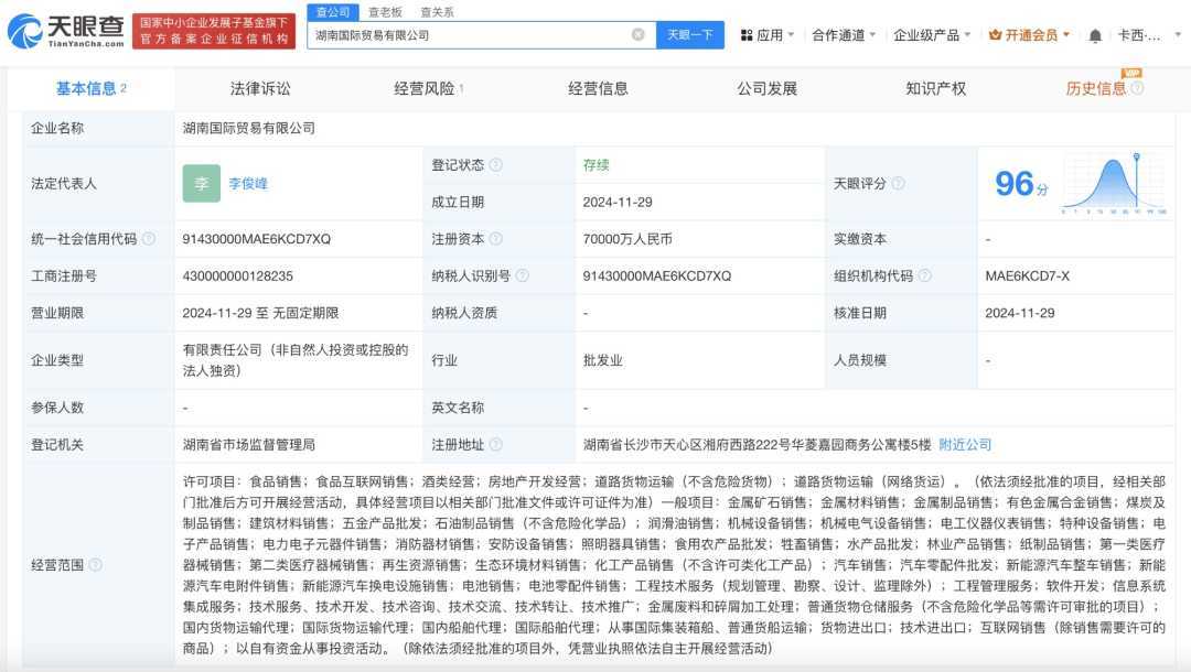 湖南国际贸易有限公司近日成立,注册资本7亿人民币,经营范围广泛,包括汽车销售、新能源汽车销售及国际货物运输代理等,由湖南钢铁集团有限公司全资持股。