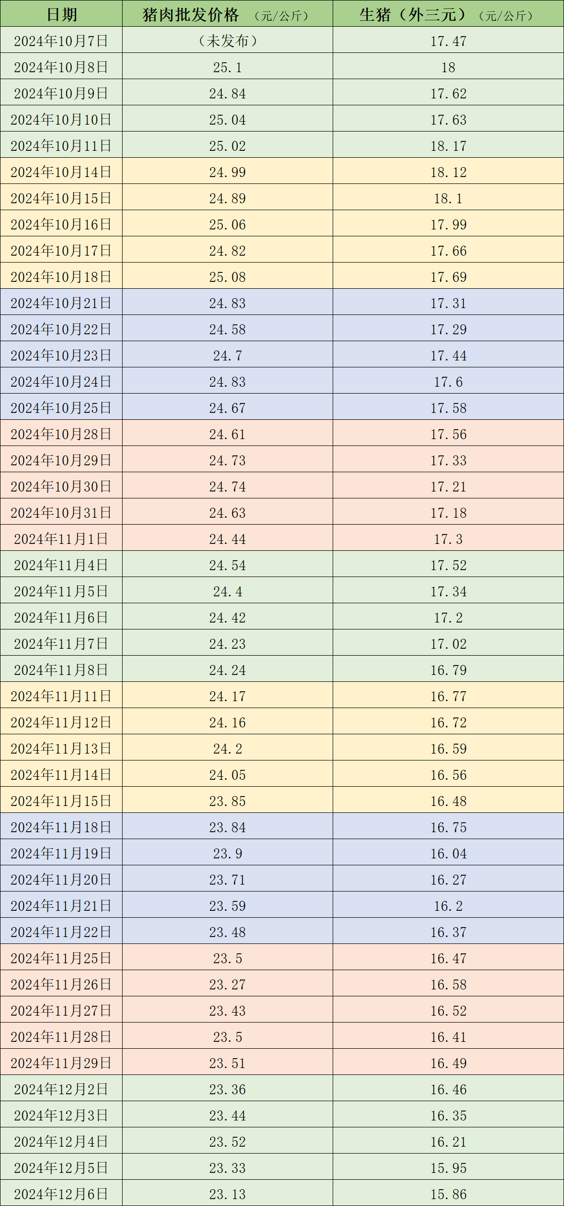 据农业农村部数据显示,12月6日全国农产品批发市场猪肉均价为23.13元/公斤,较前一周五下降1.6%,本周均价为23.36元/公斤,略降0.3%。中国养猪网数据亦显示,12月6日生猪(外三元)价格为15.86元/公斤,较前一周五下降3.8%,本周均价为16.17元/公斤,降幅1.9%。