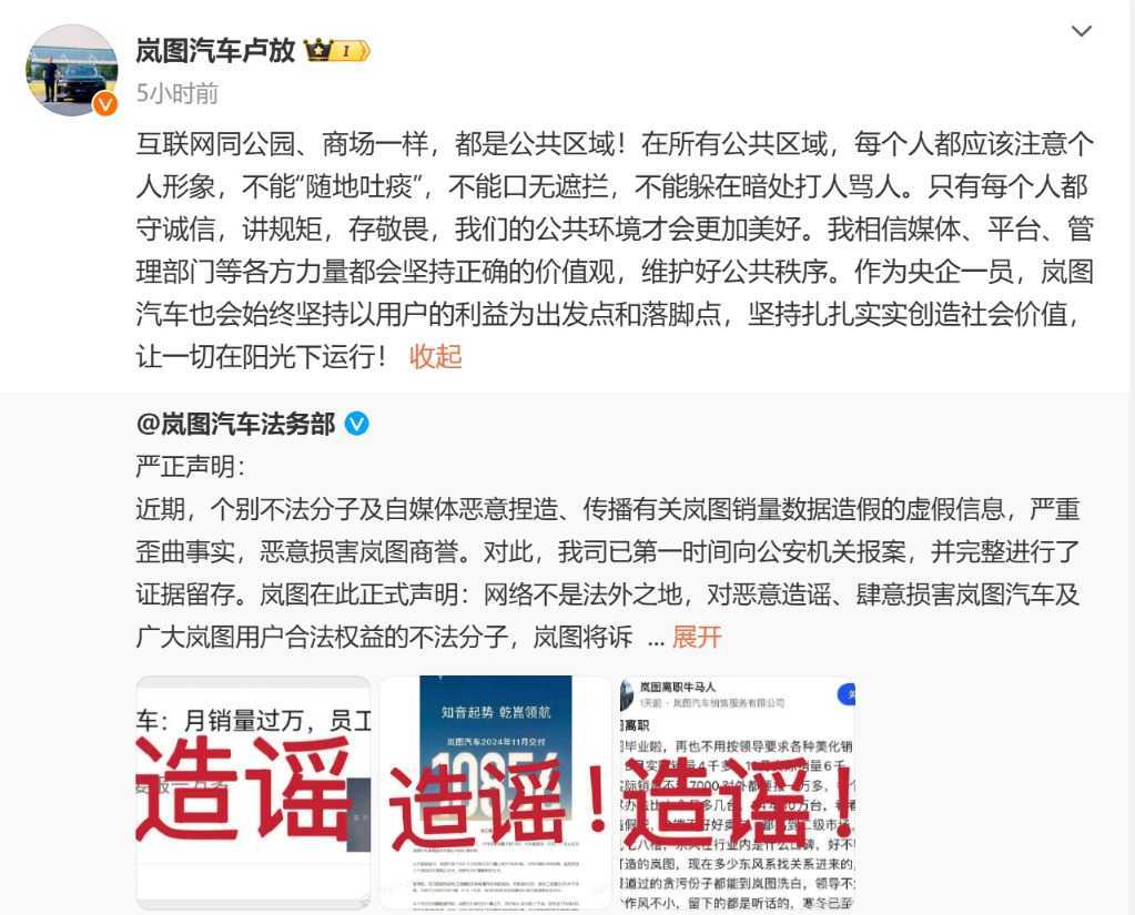 面对这一指控,岚图汽车法务部于12月6日晚紧急发表声明,称上述内容严重歪曲事实,并已向公安机关报案。岚图汽车CEO卢放也公开发言,强调岚图作为央企一员,会始终坚持以用户利益为出发点,坚持创造社会价值,让一切在阳光下运行。