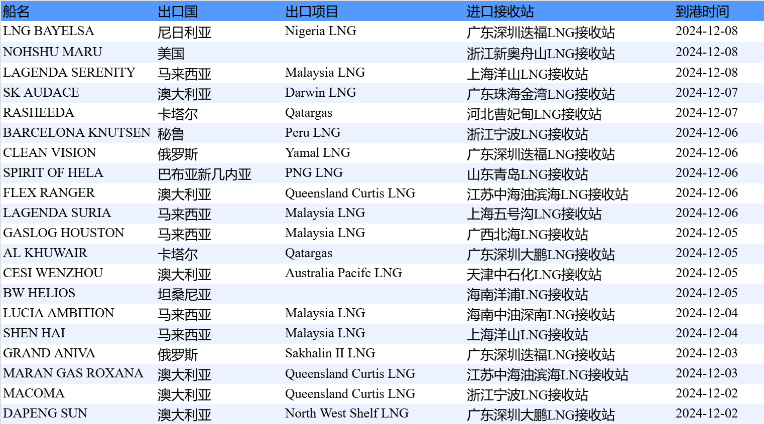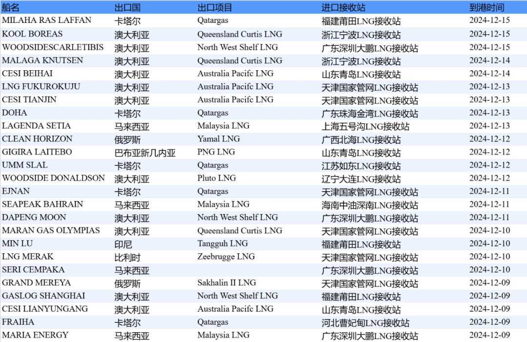 表2详细列出了12月9日至12月15日的中国LNG进口预测情况,具体数据请见附图,同样来源于中国天然气信息终端(E-Gas系统)。