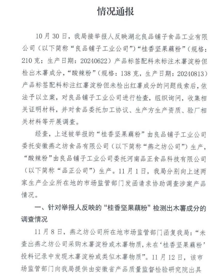 11月18日,武汉市东西湖区市场监督管理局正式发布通报,针对近期举报人反映的湖北良品铺子食品工业有限公司委托生产的“‘桂香坚果藕粉’检测出木薯成分”以及“‘酸辣粉’未检测出红薯成分”的质疑,经两地市场监管部门协查及该局深入调查后,确认相关指控并不成立。