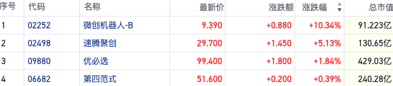 截至发稿,微创机器人-B(02252.HK)今日涨幅超过10%,一度攀升至18%的高位,速腾聚创(02498.HK)也上涨超过5%,第四范式(06682.HK)和优必选(09880.HK)同样跟随上涨趋势。