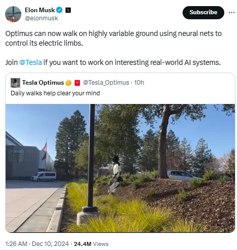 视频中,Optimus在山丘斜坡上稳健行走,展现出强大的适应性和稳定性。特斯拉CEO埃隆·马斯克在社交媒体上透露,这款机器人通过神经网络控制电动肢体,无需远程操控即可在崎岖地形上自由行走。